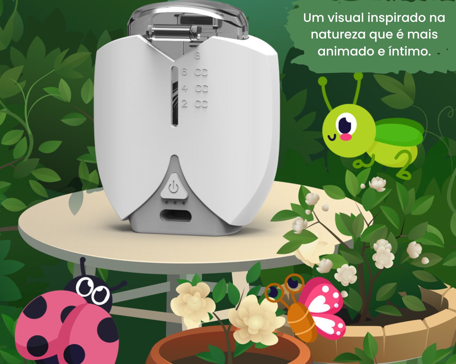Para deixar esse processo descontraído, divertido e inspirado na natureza,  foi criado o Mini Nebulizador Portátil Mãos Livres, composto por uma máscara que se encaixa no inalador deixando as mãozinhas livres, permitindo que a criança se distraia com brinquedos ou ouvindo uma linda historinha pelo celular enquanto realiza o tratamento, nem vai perceber  passar esses loooongos minutinhos.